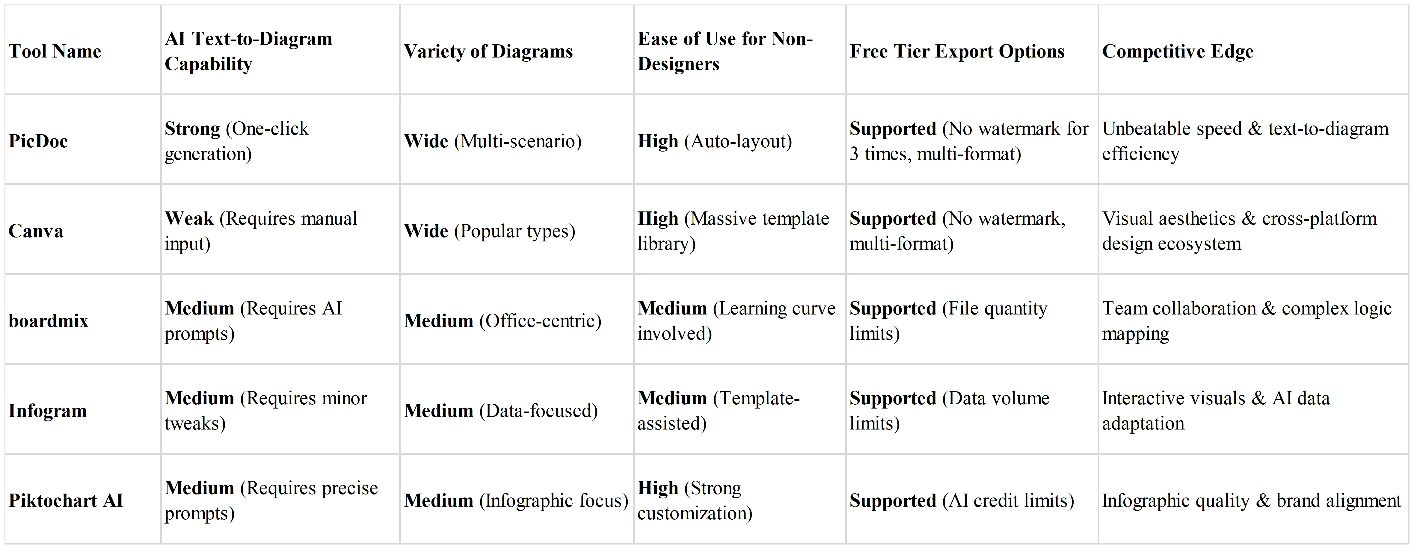 - The "All-in-One" Myth: Many users assume that more features equate to a better tool, chasing software that claims to do everything from multi-modal generation to complex data modeling. In reality, different tools have different strengths. For instance, while Infogram excels at data adaptation, PicDoc is optimized for text-to-diagram speed. Choosing an overly complex tool for simple, rapid tasks only adds unnecessary operational friction.