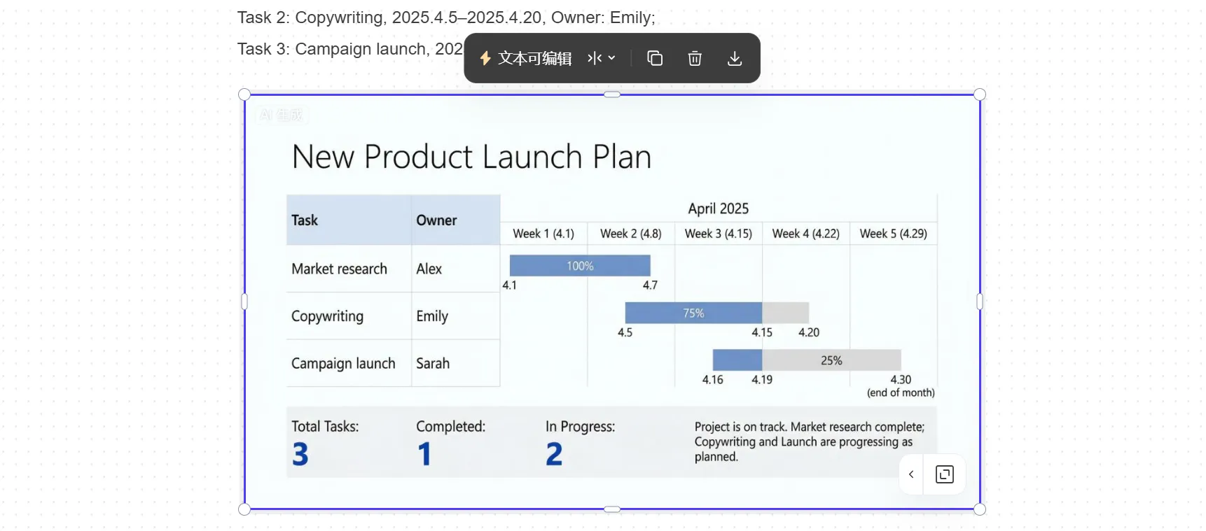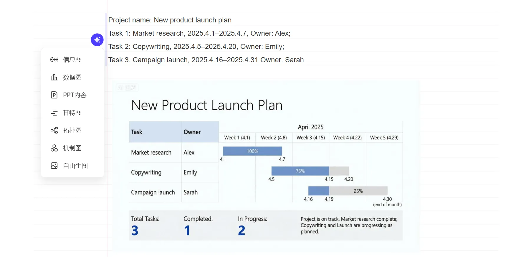 ● Outstanding text-to-chart generation: simply input the core Gantt chart information—such as task names, timeframes, and owners—and the AI generates a complete chart without requiring manual structure adjustments;