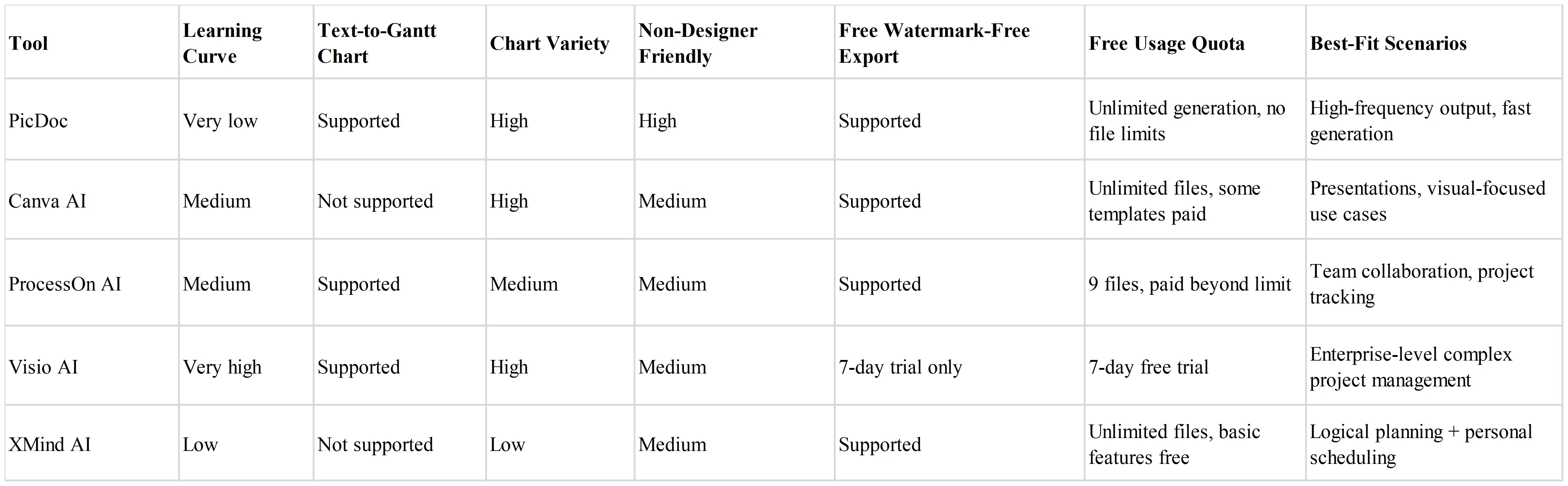Based on hands-on testing, PicDoc is not positioned as an "all-in-one" tool, but it performs exceptionally well in scenarios where non-design users need to generate Gantt charts efficiently. With simple text input, PicDoc can produce professional Gantt charts, while also supporting watermark-free exports in the free version and multiple chart types. These features are more than sufficient for everyday use.