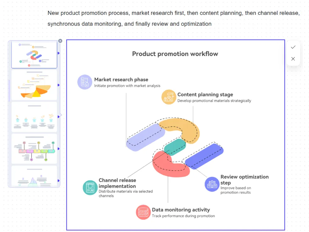 For example, if you want to sort out the "online promotion process for new Internet products", just enter: "New product promotion process, market research first, then content planning, then channel release, synchronous data monitoring, and finally review and optimization."