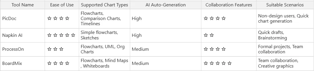 With the increasing demand for charts and flowcharts in the workplace and education sectors, choosing the right tool to quickly create clear and professional charts has become crucial. Whether you’re making year-end reports, project presentations, or daily data analysis, flowchart tools are indispensable in the workplace. Today, we’ll help you understand the strengths and weaknesses of several leading tools in the market—PicDoc, Napkin AI, ProcessOn, and BoardMix—so you can choose the one that best suits your needs.