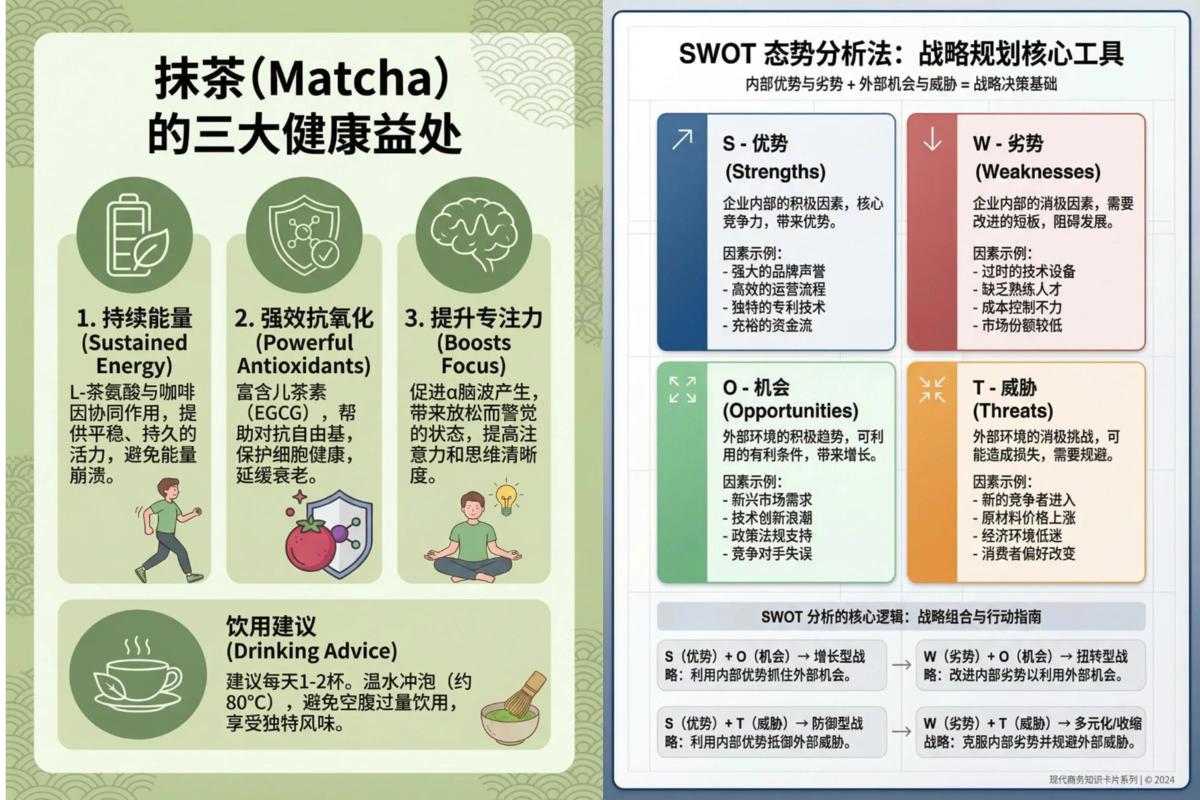 ① Create a knowledge card about the 3 key health benefits of matcha, including sustained energy, antioxidants, improved focus, and drinking tips.
