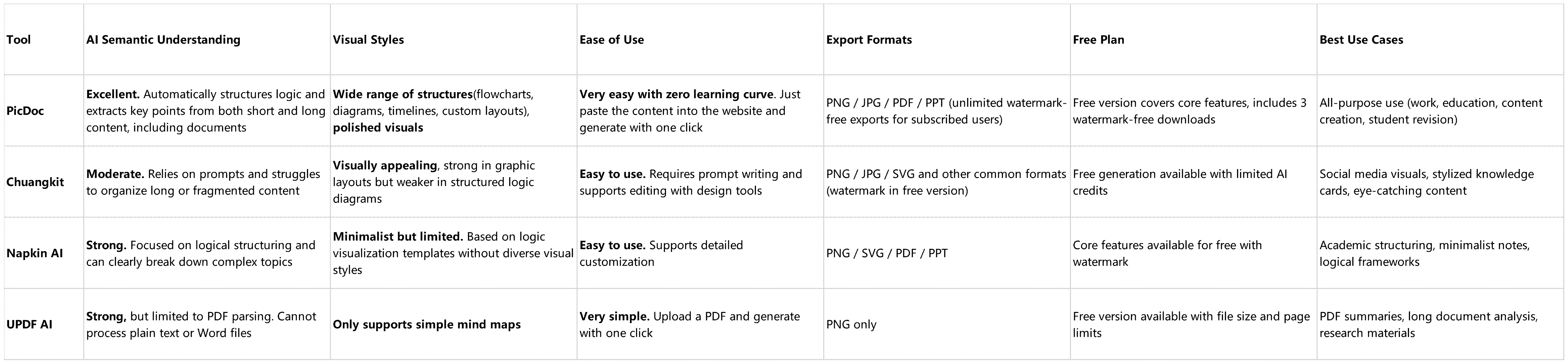 If you're a beginner or someone who frequently creates knowledge cards, and you want a solution that requires no design skills, no complex setup, and can instantly generate clear key points with high-quality visuals, PicDoc stands out as the most well-rounded option. With strong semantic understanding, a zero-learning-curve experience, broad use cases, and excellent value for money, it's a reliable choice whether you're just getting started or planning long-term use.