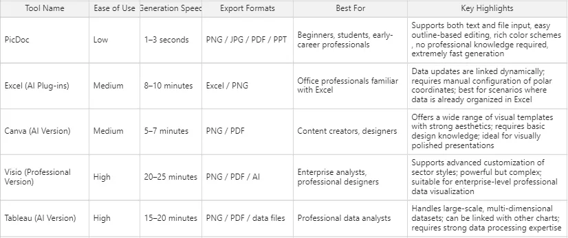Evaluation Conclusion: For users with no prior experience who prioritize efficiency, PicDoc is the top choice, as it requires no learning of professional logic or complex operations; those who already use Excel to organize data can opt for an Excel AI plugin; Canva is recommended for users who need visually appealing charts; and Visio or Tableau are suitable for enterprise-level in-depth data visualization.