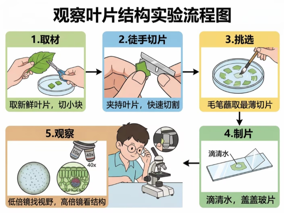 The first flowchart I created using PicDoc was for the operational steps of 'Observing Leaf Structure.' During class, I asked students to repeat the sequence of operations without referring to the diagram. Among the 38 students in the class, 35 were able to accurately recount the entire sequence.