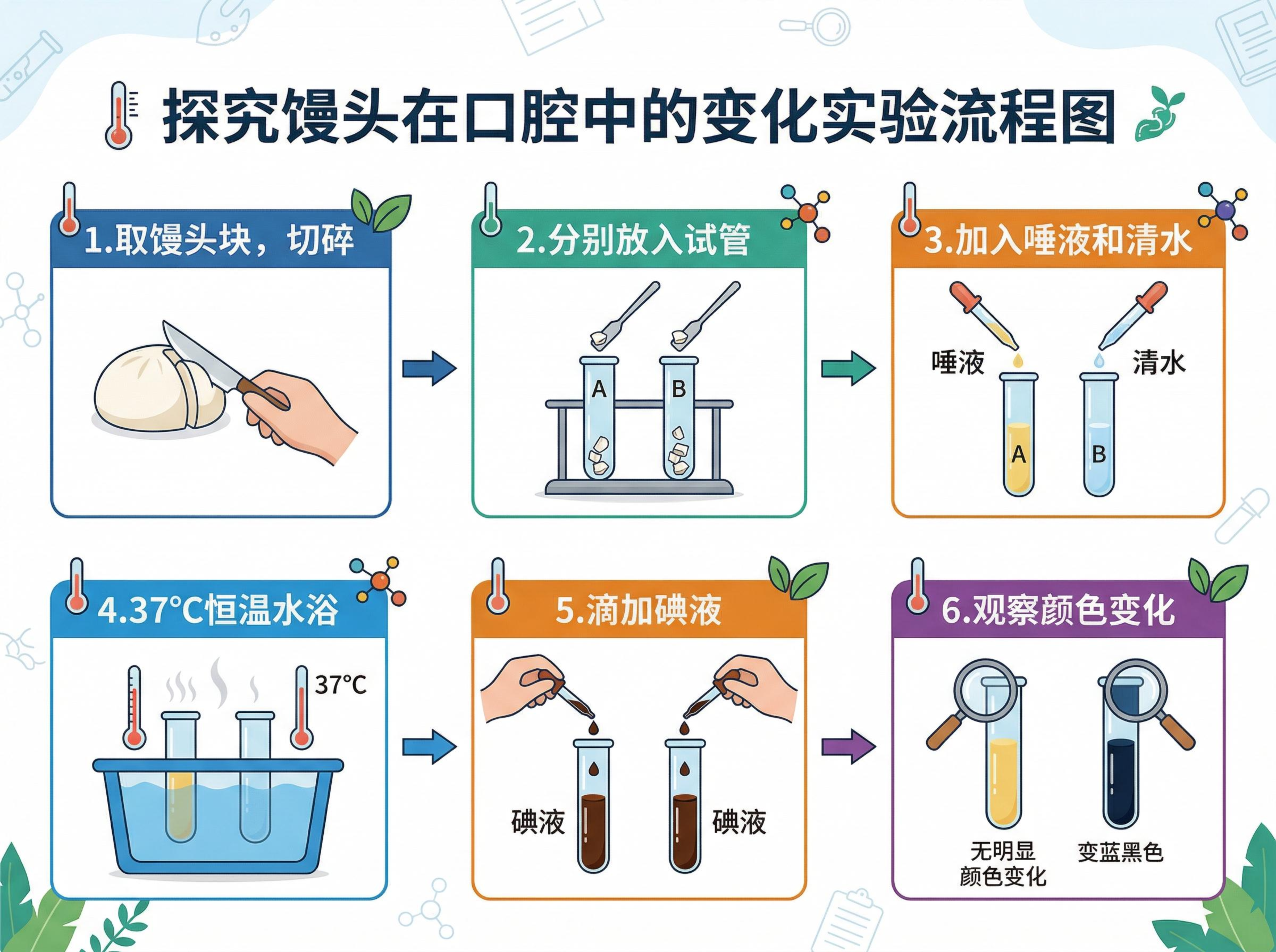 Experimental flowchart for investigating changes in steamed buns in the oral cavity: 1. Take steamed bun pieces and chop them into small pieces; 2. Place the pieces into test tubes separately; 3. Add saliva and water; 4. Maintain constant temperature in a water bath at 37°C; 5. Add iodine solution dropwise; 6. Observe color changes.