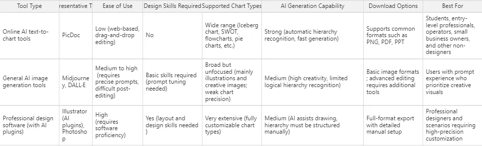 Summary: For non-professional users, online AI text-to-chart tools like PicDoc are the best choice, balancing ease of use, chart professionalism, and post-editing flexibility. For advanced or highly customized design needs, more powerful professional tools such as Midjourney or design software may be appropriate.