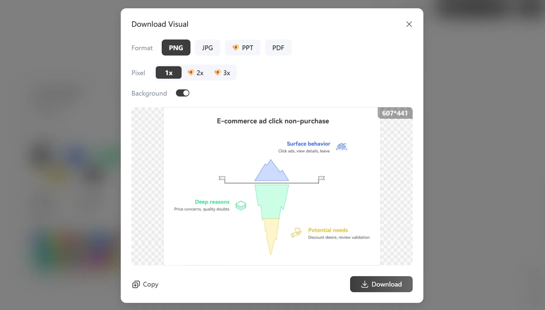 Once you're satisfied with the result, click the "Download" button in the editor and choose common formats such as PNG or PDF. Save the file locally or copy it directly for use in presentations, academic papers, or marketing and content operations.