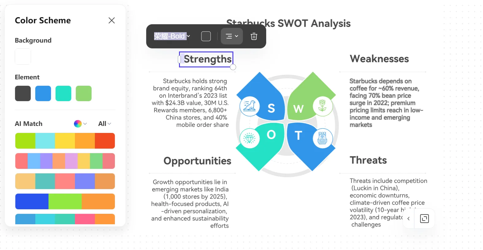 Completing the analysis chart is not the end; you can proceed to delve deeper into critical questions such as "how to align Strengths with Opportunities to maximize strengths" and "how to use Opportunities to overcome Weaknesses.". Whether it is tapping into your inner strengths to connect with outside trend dividends or correlating with outside conditions that can be leveraged to enhance weaknesses, the result of such strategy conclusions can be intuitively demonstrated using other chart tools of PicDoc, hence making the chain of reasoning more apparent and the path of implementation more concrete.