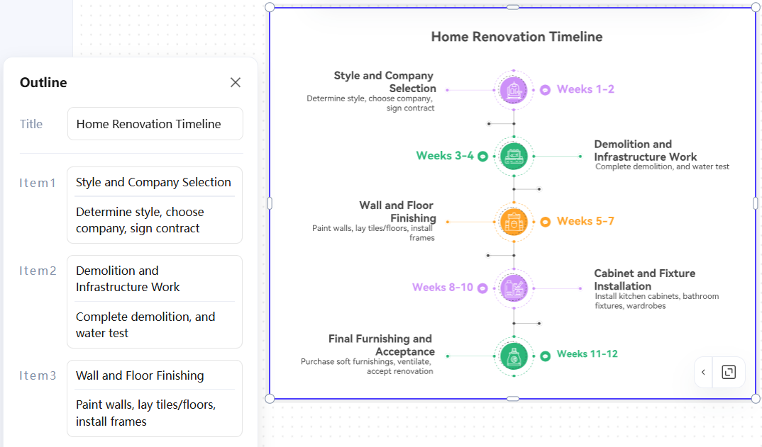 If the milestone requires additional background content, you can directly edit note content within PicDoc's outline. The timeline chart will be automatically modified, sparing the inconvenience of manually redoing text box formats and gaps in content in the event of presentations.