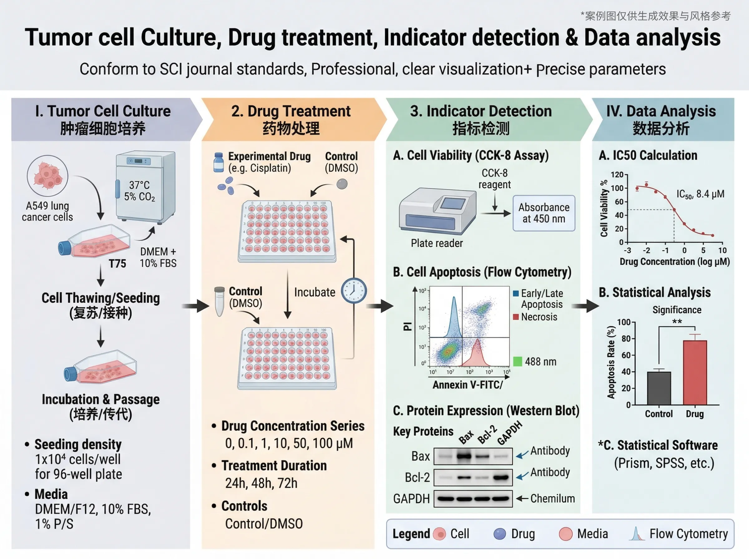 Besoin de l'utilisateur :Créer un diagramme de flux de travail illustrant la méthode expérimentale "culture de cellules tumorales → traitement médicamenteux → détection d'indicateurs → analyse de données", avec les paramètres clés étiquetés à chaque étape. La figure doit maintenir une palette de couleurs propre et professionnelle.