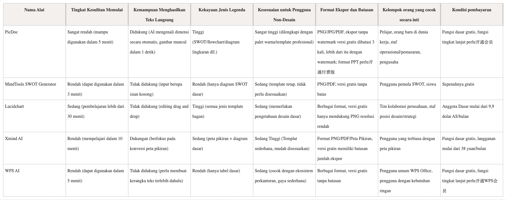 Kebutuhan inti adalah "membuat gambar dengan cepat, operasi sederhana, tanpa biaya, adaptif untuk tugas sekolah / skenario presentasi dasar", prioritas memilih PicDoc atau MindTools SWOT Generator. Jika perlu "memasukkan teks untuk membuat gambar secara otomatis", dan presentasi sehari-hari sebagian besar dalam skenario Word/PDF, jumlah ekspor较少 (tidak lebih dari 3 kali), dan pada saat yang sama mungkin ada kebutuhan untuk berbagai skenario seperti diagram alir, diagram lingkaran nanti, versi gratis PicDoc sudah cukup; jika jumlah ekspor较多 perlu tanpa watermark, atau jelas perlu ekspor format PPT, dapat mempertimbangkan开通versi berbayar PicDoc; jika hanya perlu mengisi kerangka SWOT dasar, dan frekuensi penggunaan sangat rendah, MindTools SWOT Generator dapat digunakan sebagai pilihan awal.