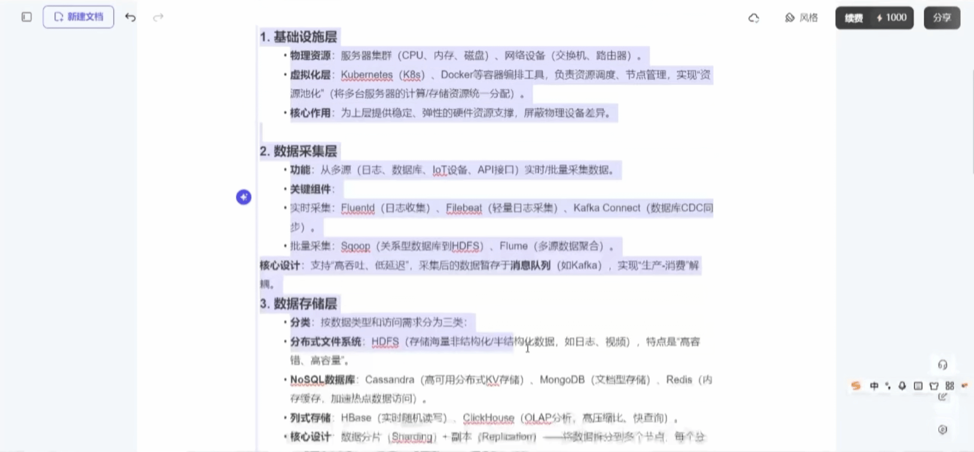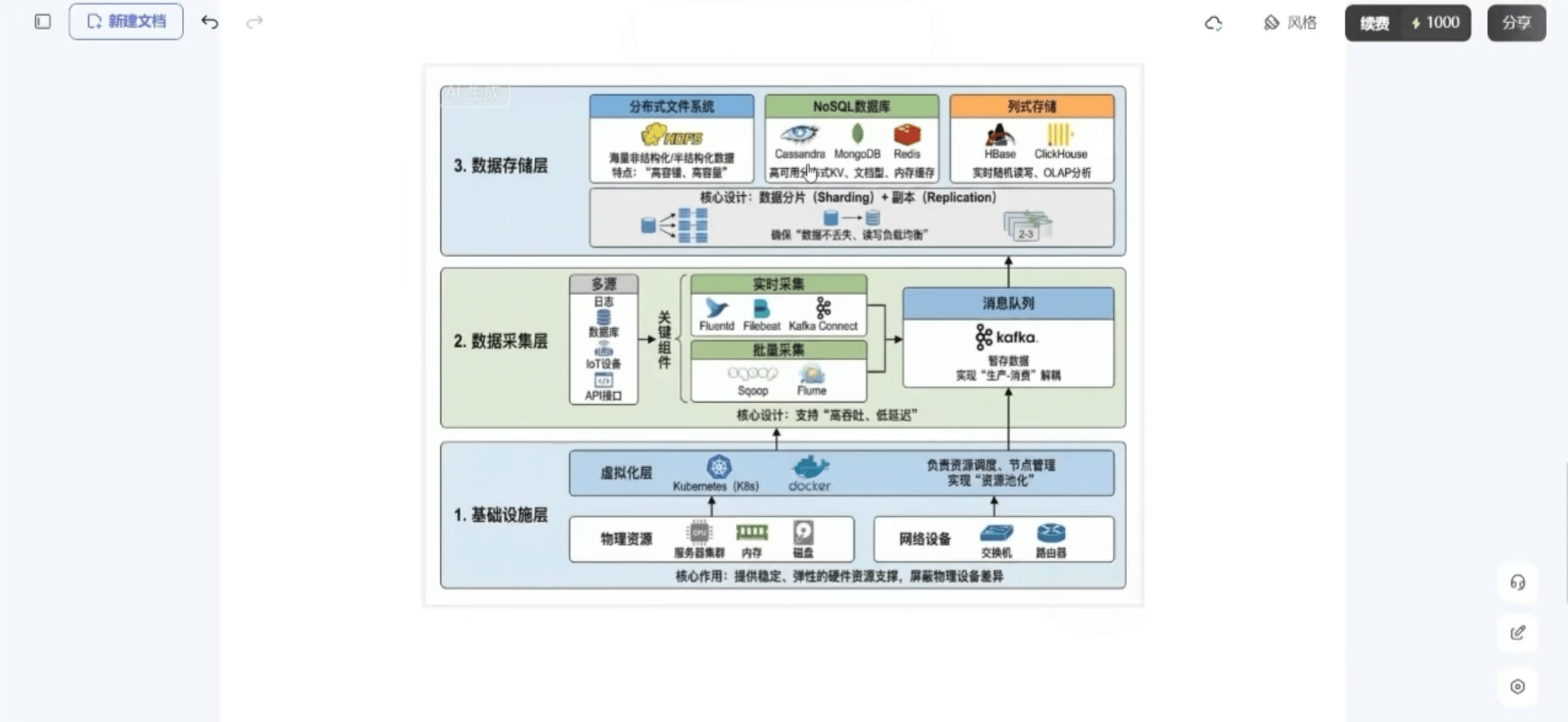 PicDocでの操作:各層のテキスト説明と主要機能を入力し、「カスタム生成」を選択してワンクリックで生成。完成したアーキテクチャ図は階層構造がわかりやすく、機能注記も明確で、全体のビジュアルはシンプルかつ洗練された印象です。技術プレゼンテーションや提案書にそのまま使用でき、図表や図解の作成にかかる時間を大幅に削減します。