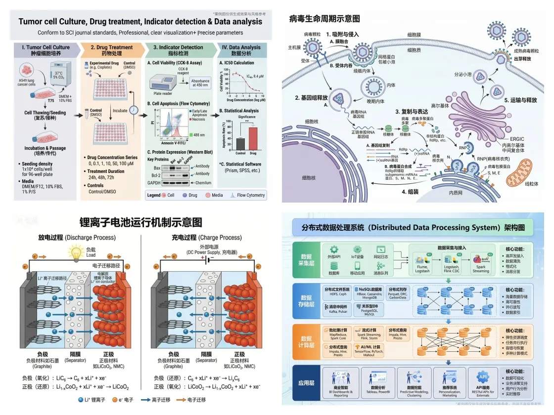 デザインスキルは不要、複雑な操作も必要ありません。テキストで内容を入力するだけで、わずか30秒でトップジャーナルレベルの科学イラスト、技術フロー図、システム構成図などを生成できます。これにより、多くの研究者は図表作成にかける時間と労力から解放され、研究そのものや技術開発に集中できるようになります。