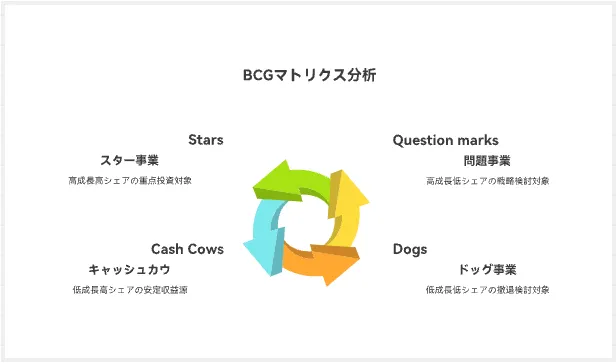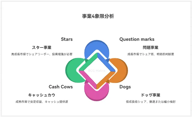 - キャッシュカウ:低成長 × 高シェア(安定した収益源)