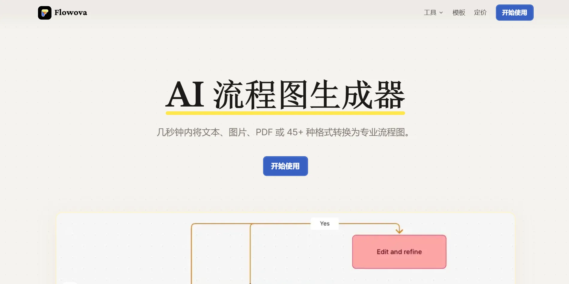Flowovaは、フローチャート作成に特化した軽量オンラインツールで、「説明入力で作成できる」シンプルな操作性が特徴です。