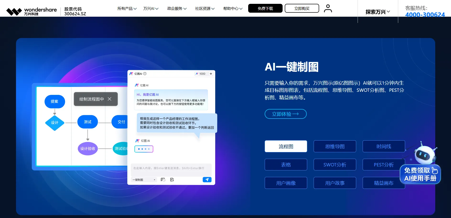 - 要件を入力するだけで、フローチャート、マインドマップ、SWOT、PESTなど20種類以上の専門図表を自動生成