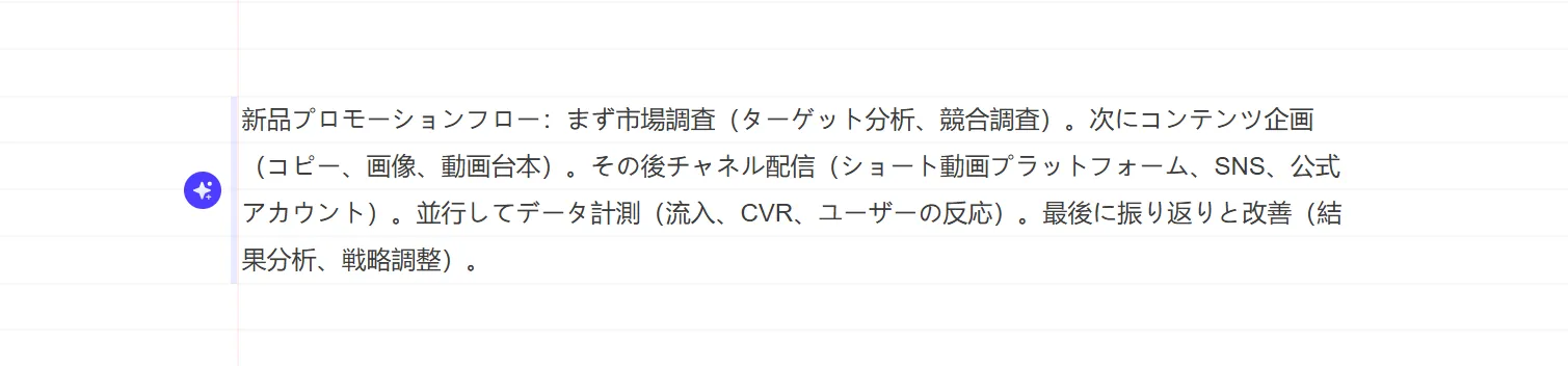 例えば、「新商品のオンラインプロモーションの流れ」を図にしたい場合、以下のように文章で流れを書くと──