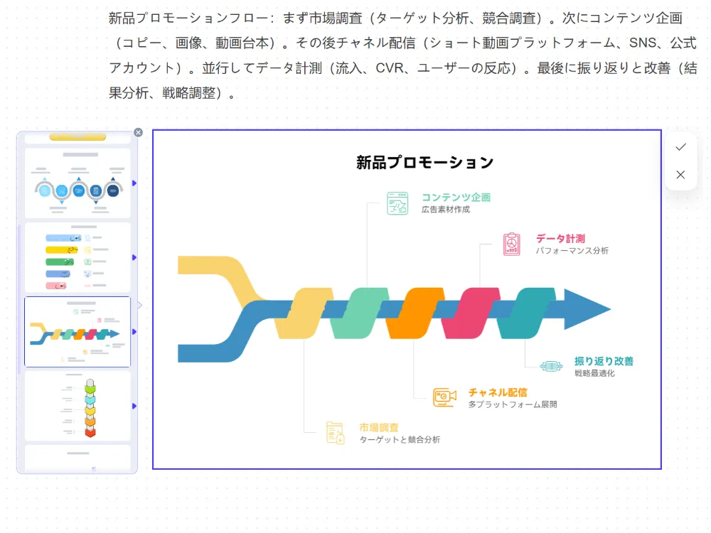 PicDocは生成後の編集も非常にスムーズで、変更したい部分をドラッグ&ドロップ、またはパネルで直感的に編集できます。例えば: