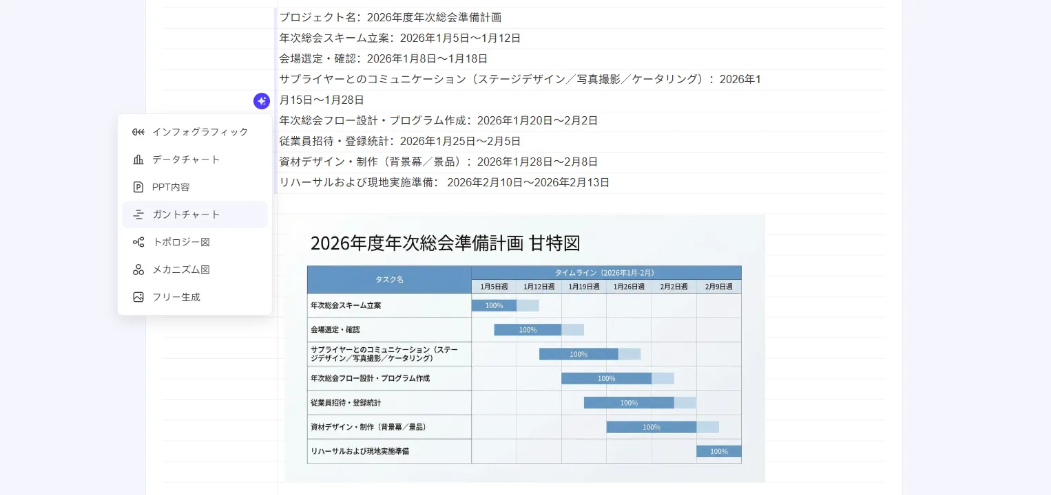 また、PicDoc で生成されたガントチャートは内容の更新にも対応しており、準備期間中に発生するスケジュール変更やタスク調整も即座に反映できます。これにより、イベント準備の進行状況を常に最新の状態で把握することが可能になります。