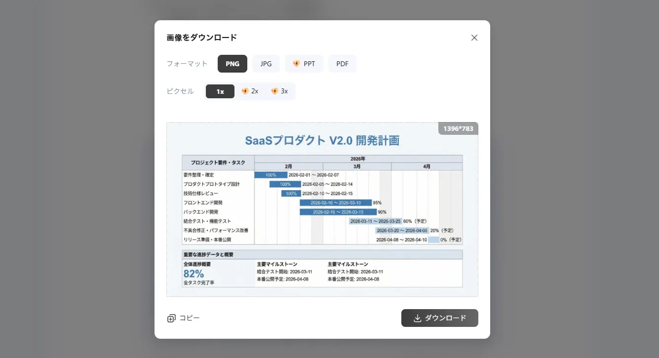 ガントチャートだけでなく、構造図・比較図・タイムラインなど複数の図表形式に対応。プロジェクト管理から戦略整理、社内外の資料作成まで幅広く活用可能です。 - オンライン完結