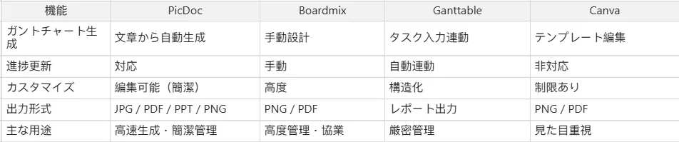 本記事では、代表的なAIガントチャート関連ツールを同一基準で比較し、それぞれの強み・弱みを客観的に整理します。その上で、自動生成と実務効率の観点からPicDocがどのような立ち位置にあるのかを検証します。