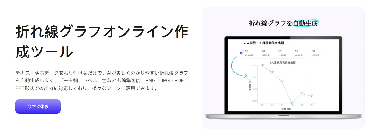 前は、多くの人がこんな悩みに直面してきました:Excelで折れ線グラフを作るとデータを整列しなければならなく、Y軸の目盛りがうまく合わず、トレンドラインが不自然に見える⋯。自作のグラフは点の位置の計算が大変で、売上ピークなどの重要ポイントも目立たない。急ぎでグラフが必要なときに、簡単に使えるツールが見つからない。
