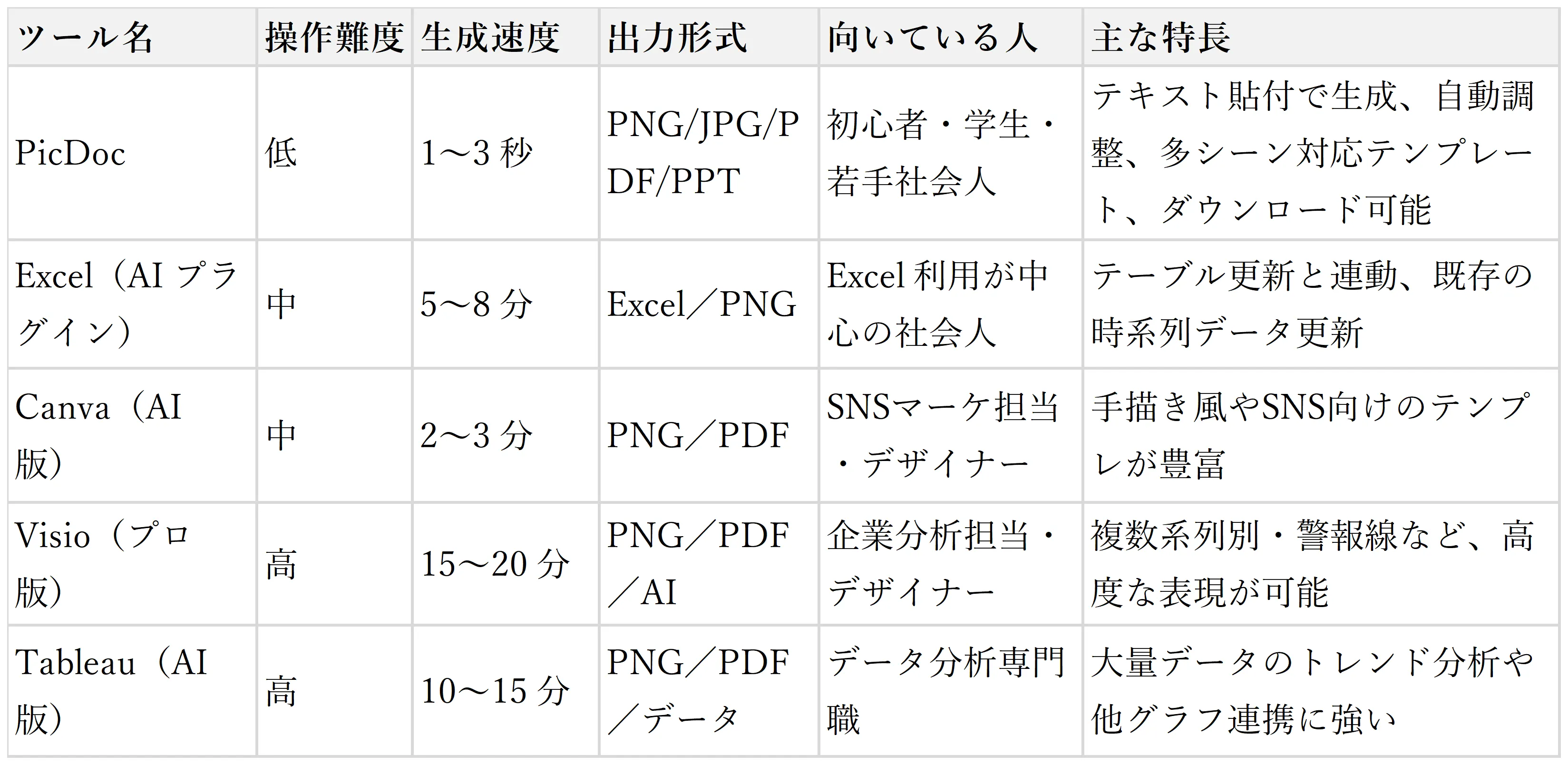 まとめ:とにかく早く簡単に作りたいならPicDoc、Excelデータが既にあるならExcel、見た目重視ならCanva、企業向けの高度分析はVisio/Tableauがおすすめです。