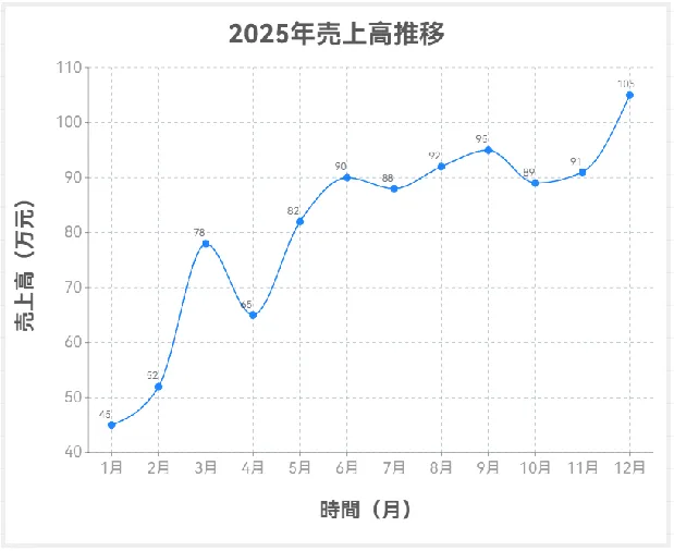 - データ整理:時間や指標をX軸(例:「1月」「2月」)、数値をY軸(例:「500件」「650件」)として自動配置し、滑らかな折れ線とデータラベルを生成