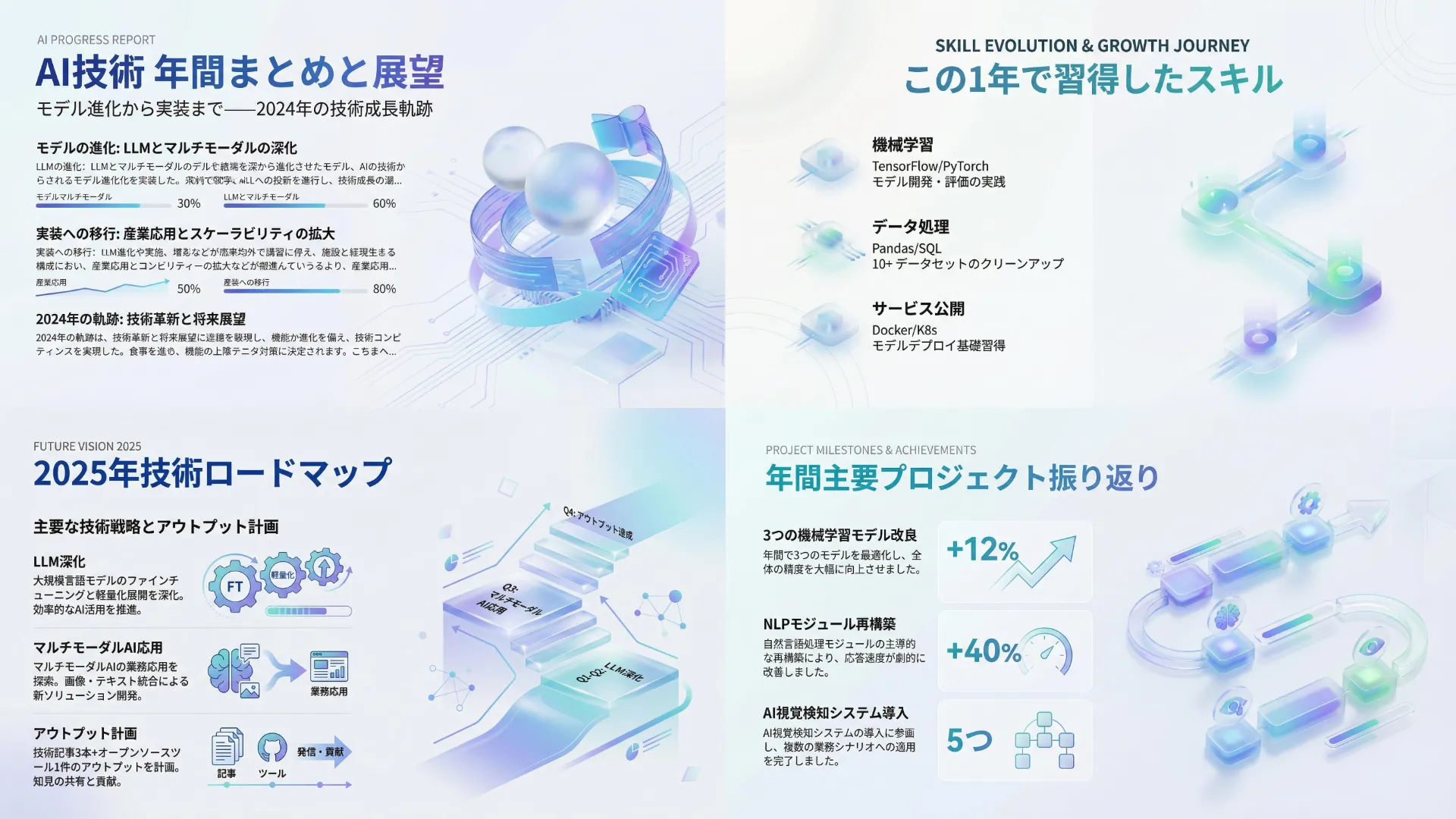 IT・テック業界に入社したばかりの若手社員が、初めて技術プロジェクトの年間まとめPPTを作成するケース。専門性とテクノロジー感をしっかり伝え、上司やマネージャーが短時間でプロジェクトの成果と技術的進化を把握できる構成が求められます。一方で、デザイン経験が少ないため、見た目が粗くならないことも重要なポイントです。