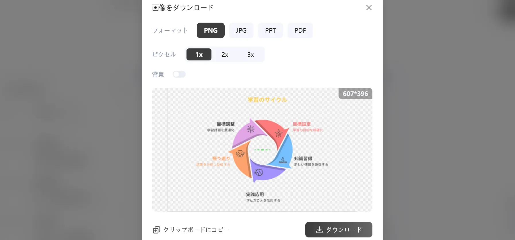 出力時にはピクセル(1x/2x/3x)や背景表示の有無も自由に選択可能。「背景なしで報告書に貼り付けたい」「印刷して掲示したい」など、用途に合わせた最適な仕上がりを実現できます。