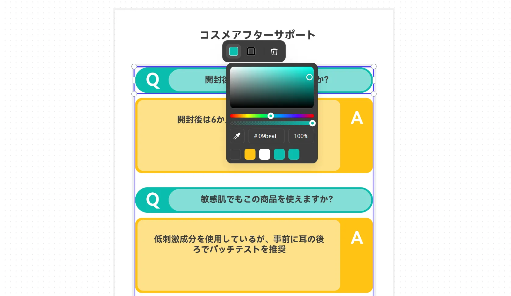 まずは、Q&Aデザインを使用するシーン(商品公式サイト、教育用スライド、SNS用ビジュアルなど)と、盛り込みたい中心内容を整理します。例えば「あるコスメ商品の主要なアフターサポートに関する3つの質問と回答をまとめる」といった形で、ゴールを明確にしておくことが重要です。