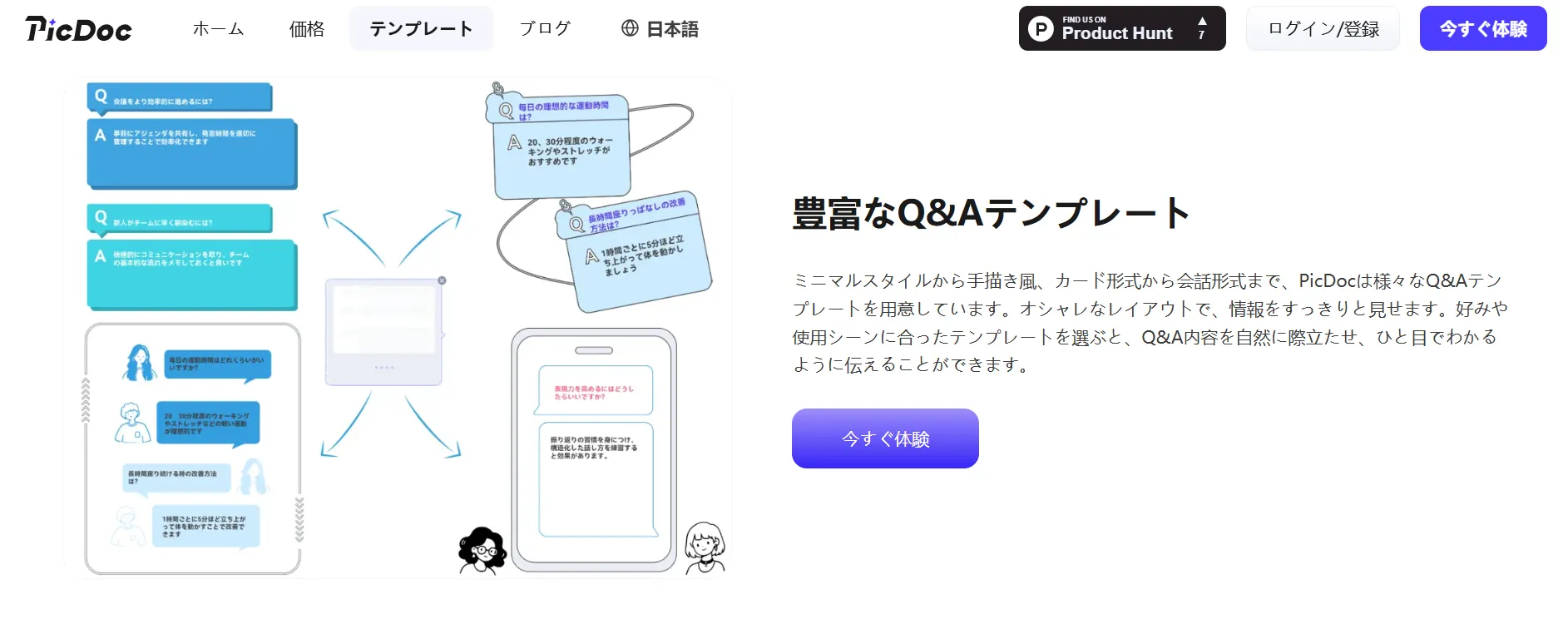 ここでは、複数のQ&Aテンプレートに対応し、デザインスキル不要で使えるオンラインAIツールPicDocを例に、具体的な操作手順を解説します。