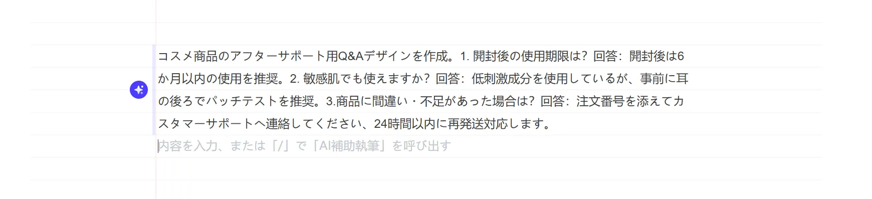 「コスメ商品のアフターサポート用Q&Aデザインを作成。1. 開封後の使用期限は?回答:開封後は6か月以内の使用を推奨。2. 敏感肌でも使えますか?回答:低刺激成分を使用しているが、事前に耳の後ろでパッチテストを推奨。3.商品に間違い・不足があった場合は?回答:注文番号を添えてカスタマーサポートへ連絡してください、24時間以内に再発送対応します。」