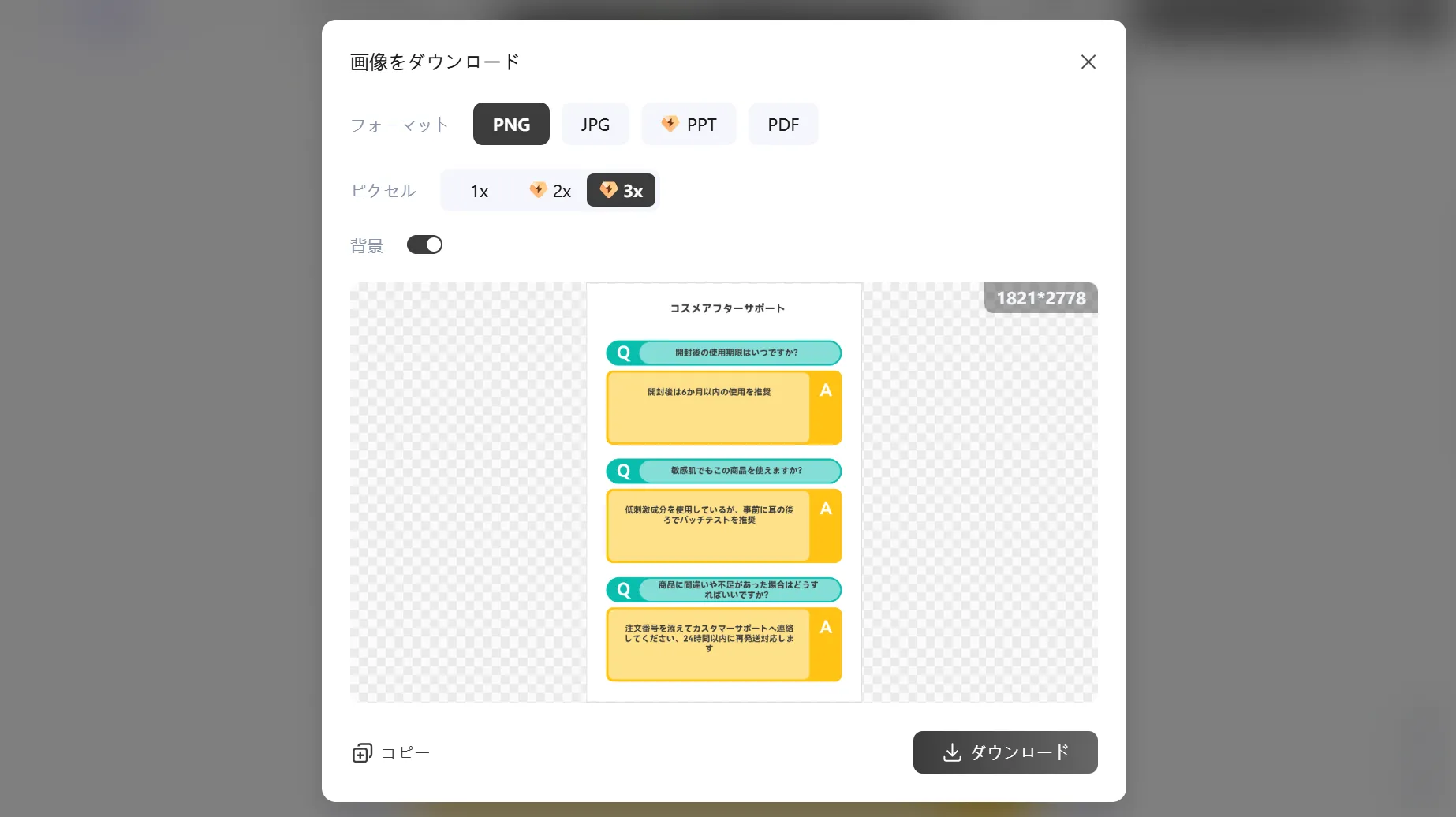 調整が完了したら、「ダウンロード」をクリックし、形式を選択します。PNG、JPG、PDFなど一般的な形式に対応しており、作成したQ&Aデザインを資料、SNS投稿、教材などにすぐ活用できます。