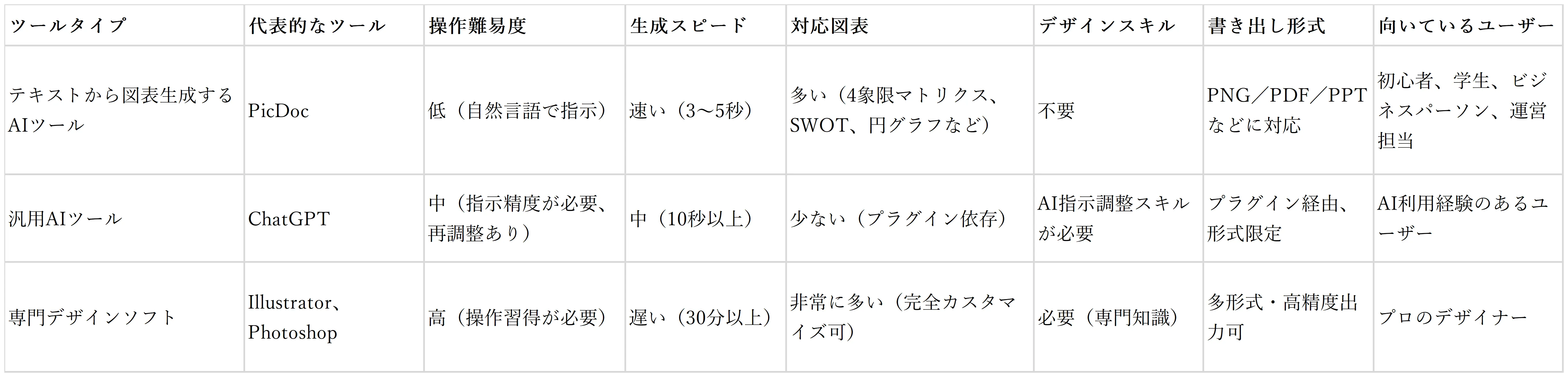 初心者は、汎用AIよりも「図表生成に特化したAIツール(PicDocなど)」を優先しましょう。精度が高く、操作もシンプルで、専門ソフトよりも圧倒的に手軽です。