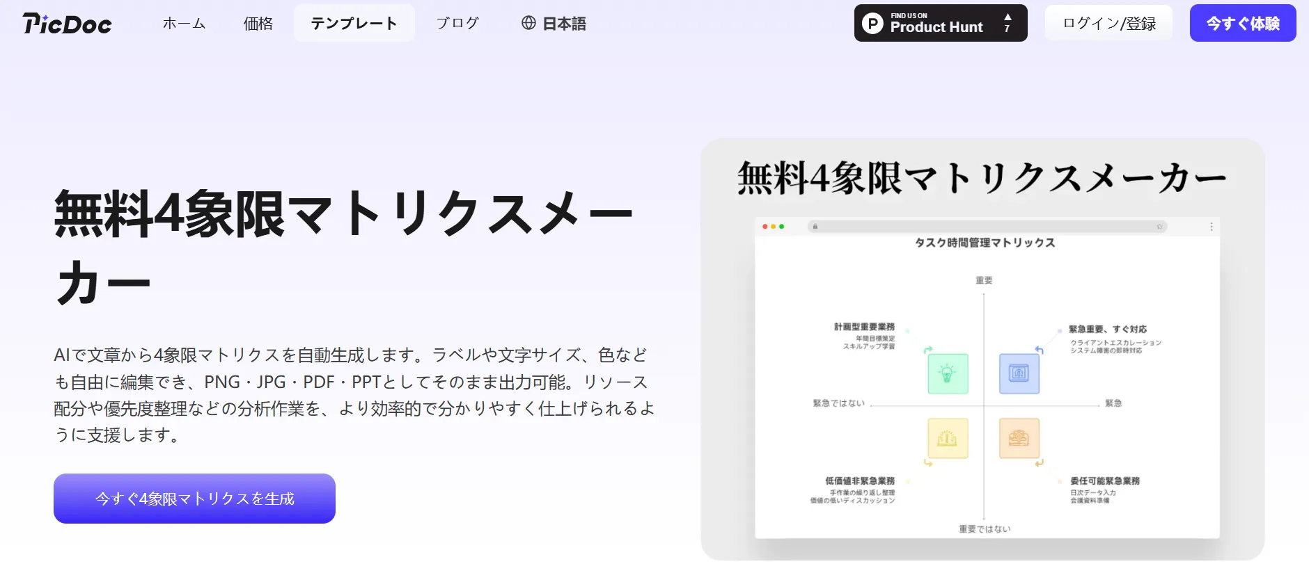 業務報告、学習計画、運営・分析業務など、どのシーンでも、高品質な4象限マトリクスは思考を整理し、作業効率を高めてくれます。今すぐPicDocを開いて、要件を入力し、AIによるマトリックス生成の手軽さを体験してみましょう!