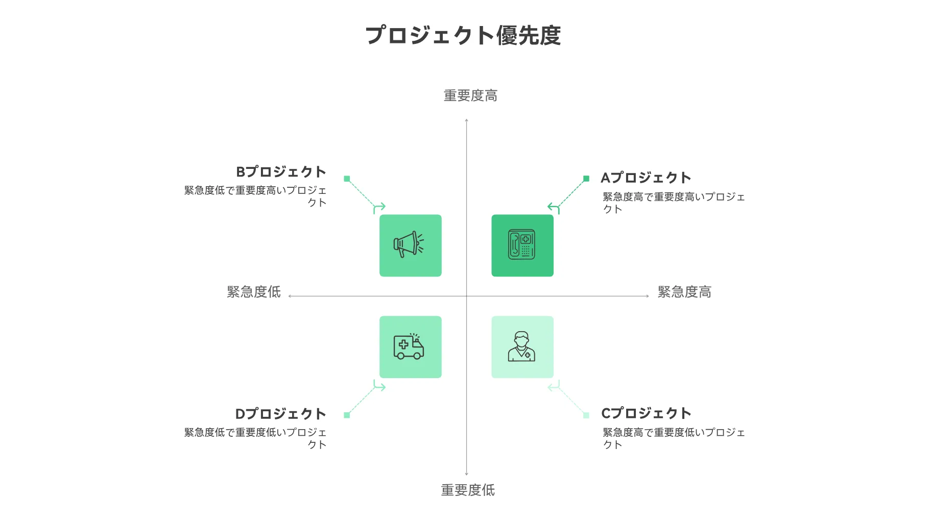- 情報:主要プロジェクト(緊急度高・重要度高)、通常プロジェクト(緊急度低・重要度高)、突発タスク(緊急度高・重要度低)、後回しタスク(緊急度低・重要度低)
