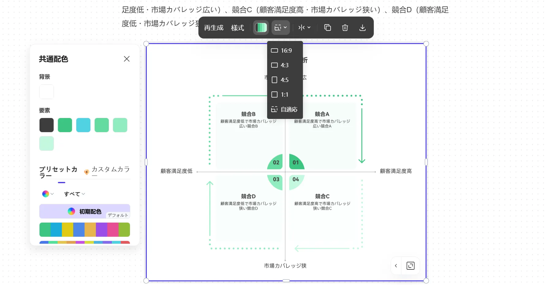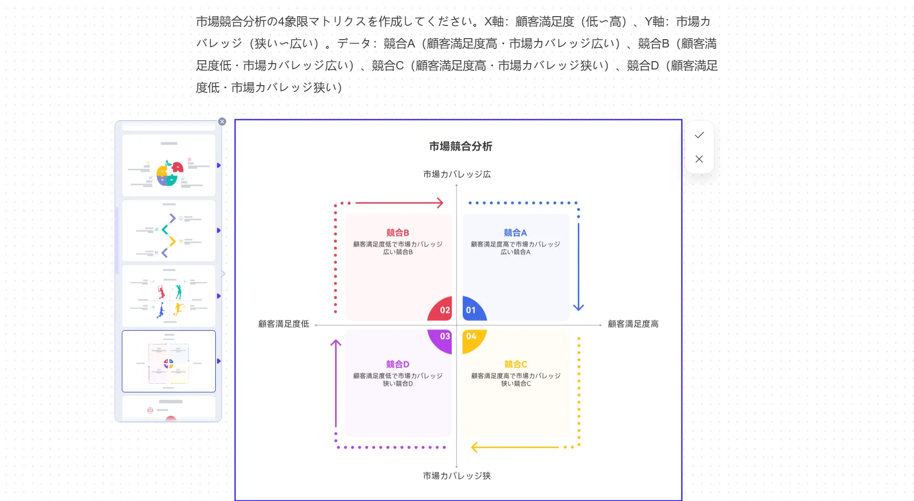 例えば、「市場競合分析の4象限マトリクスを作成してください。X軸:顧客満足度(低〜高)、Y軸:市場カバレッジ(狭い〜広い)。データ:競合A(顧客満足度高・市場カバレッジ広い)、競合B(顧客満足度低・市場カバレッジ広い)、競合C(顧客満足度高・市場カバレッジ狭い)、競合D(顧客満足度低・市場カバレッジ狭い)」と入力します。入力後に左側の青い生成ボタンをクリックすれば、数秒で4象限マトリクスが完成します。