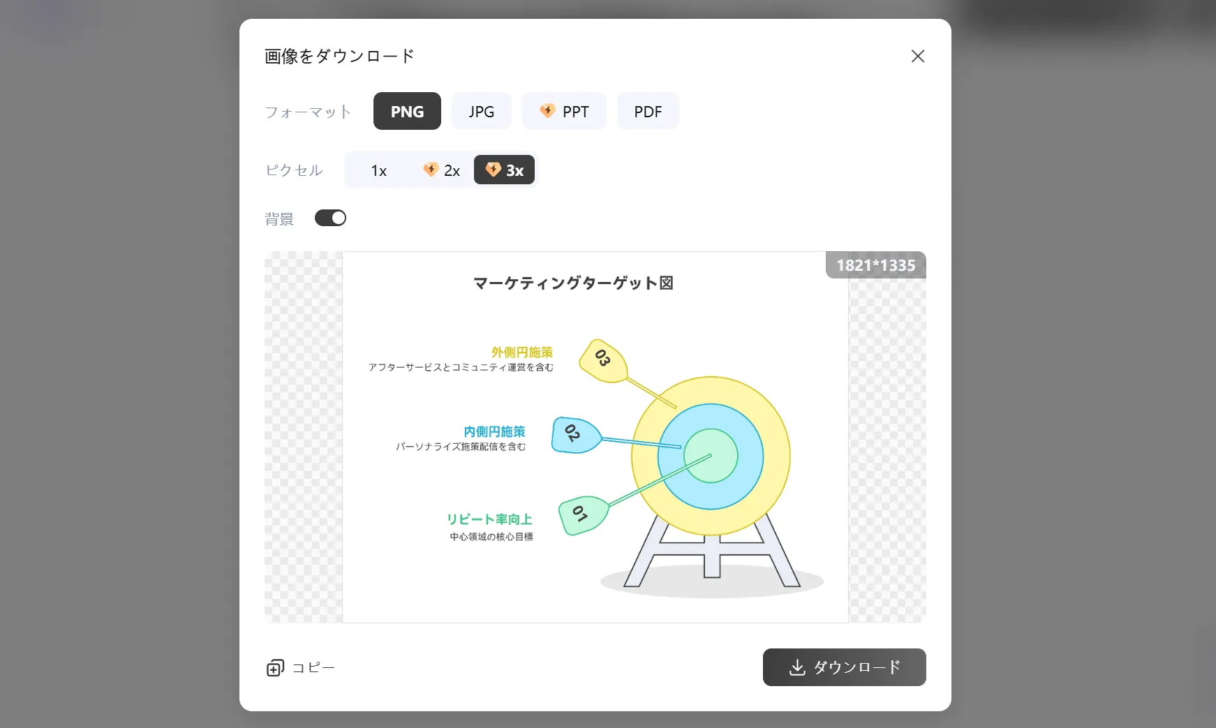 調整が完了したら、「ダウンロード」ボタンをクリックし、PNG・JPG・PDF・PPTなどの形式を選択します。