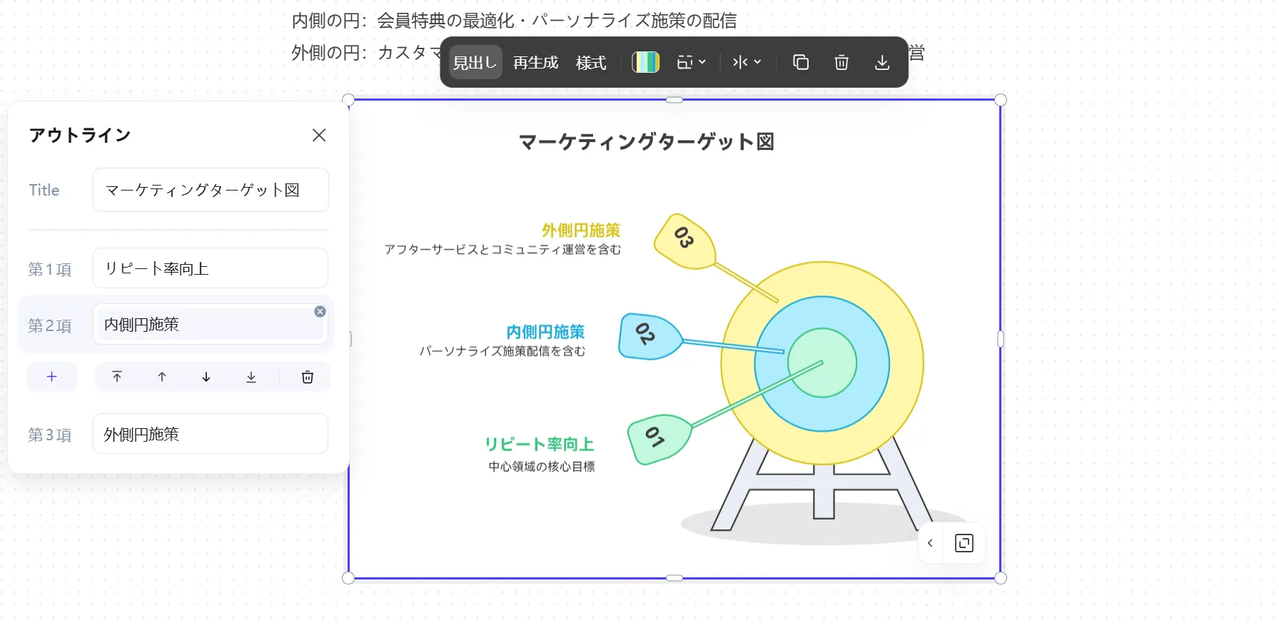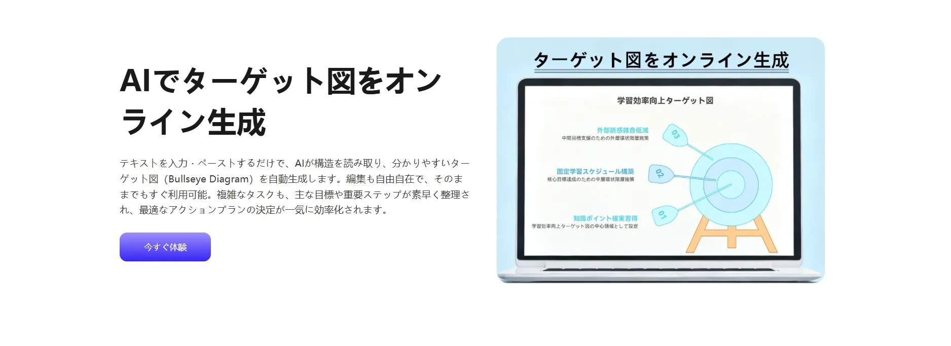 「ターゲット図はデザインが難しそう」と感じる方も多いですが、現在ではAIツールによって、テキストを入力するだけでターゲット図を自動生成できるようになっています。レイアウトや配色を手動で調整する必要はなく、誰でも簡単に使える点が大きなメリットです。