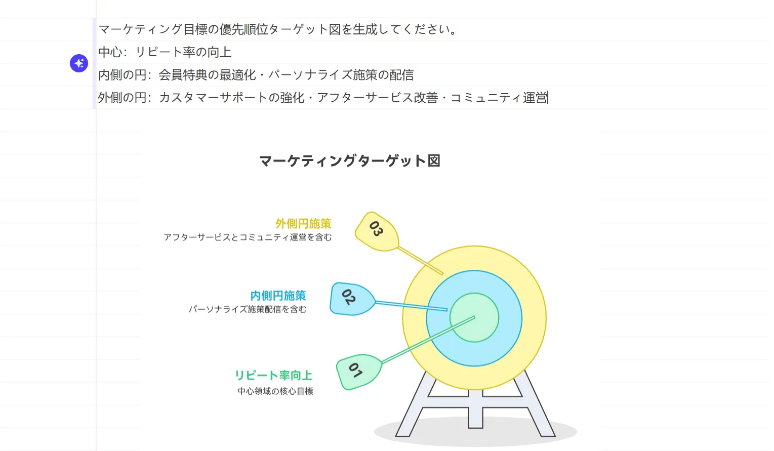 例:「ECマーケティングのターゲット図を生成。中心:売上向上、内側の円:商品ページ改善・精度の高い広告配信、外側の円:ライブコマース実施・クーポン配布・ユーザーコミュニティ構築」