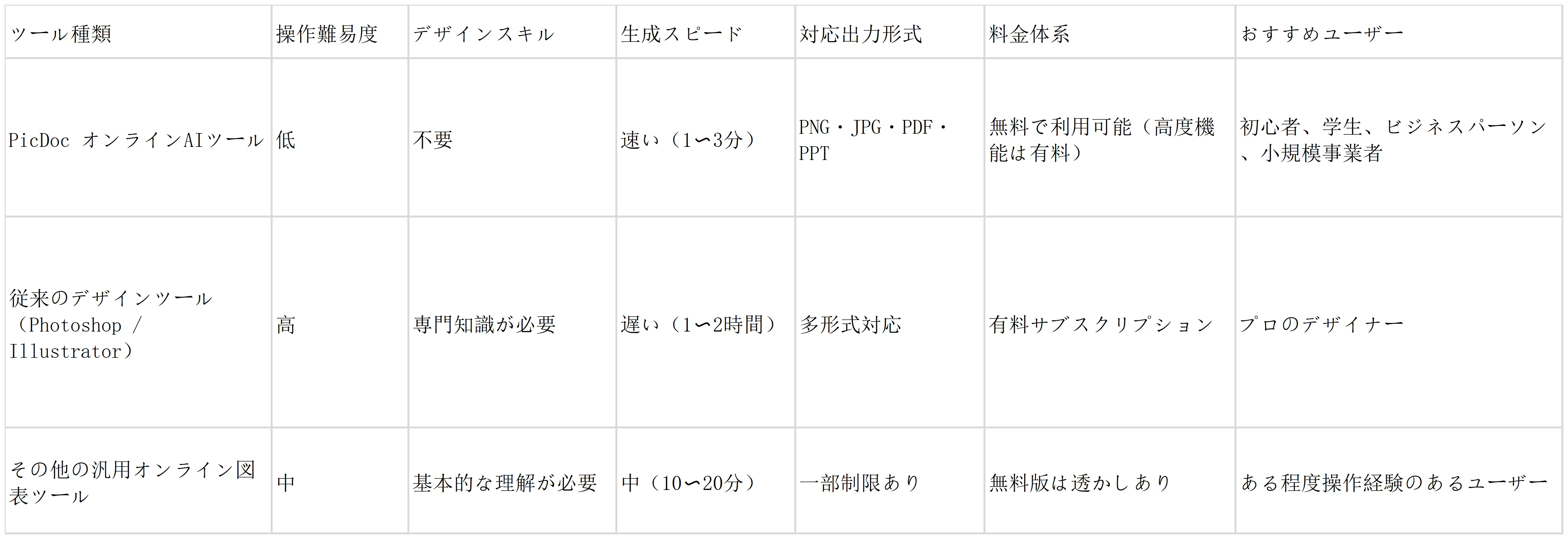 初心者には、PicDocのような「テキストから図表を生成できるAIツール」を優先的におすすめします。デザイン知識が不要で、生成スピードが速く、出力形式も多様なので、コストパフォーマンスに優れています。