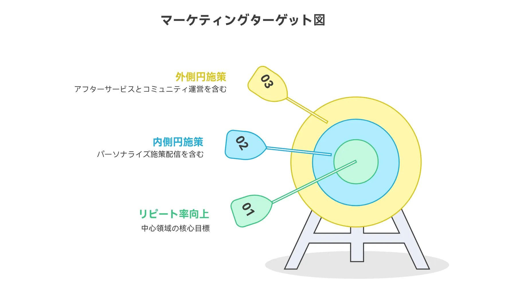 「マーケティング目標の優先順位ターゲット図を生成してください。中心:リピート率の向上、内側の円:会員特典の最適化・パーソナライズ施策の配信、外側の円:カスタマーサポートの強化・アフターサービス改善・コミュニティ運営」