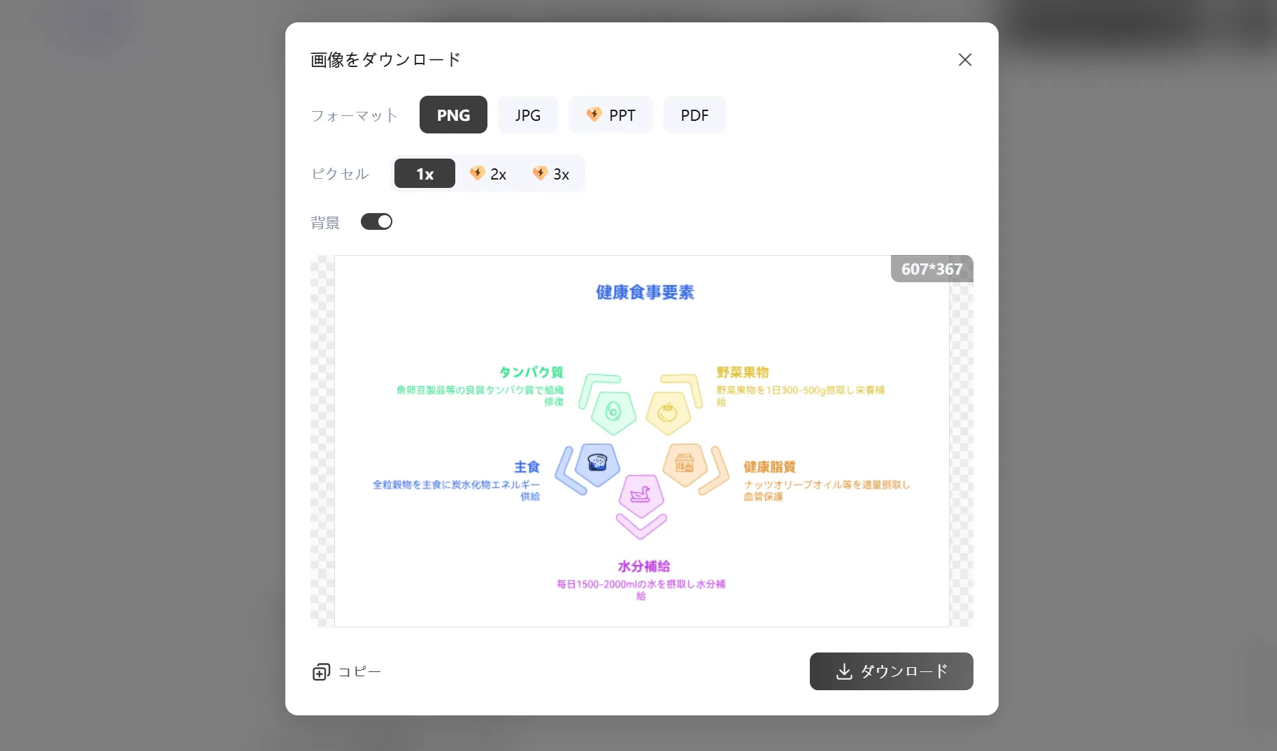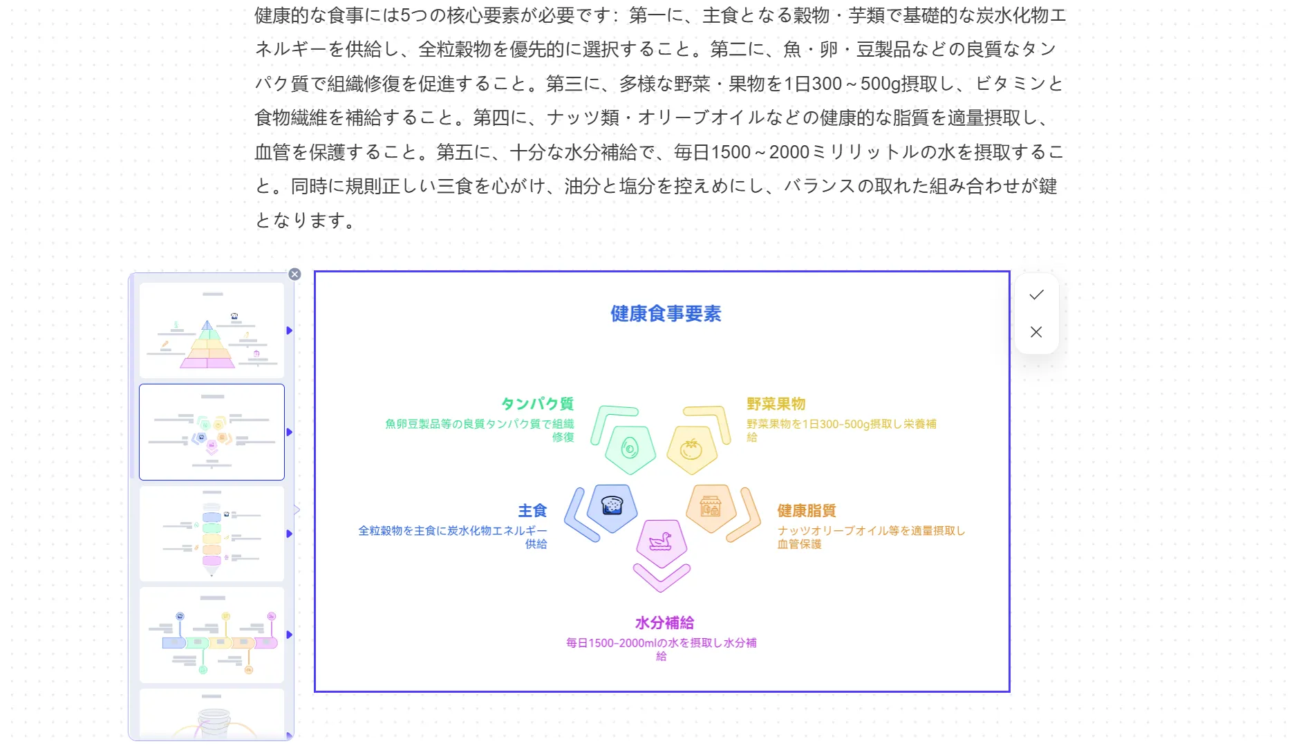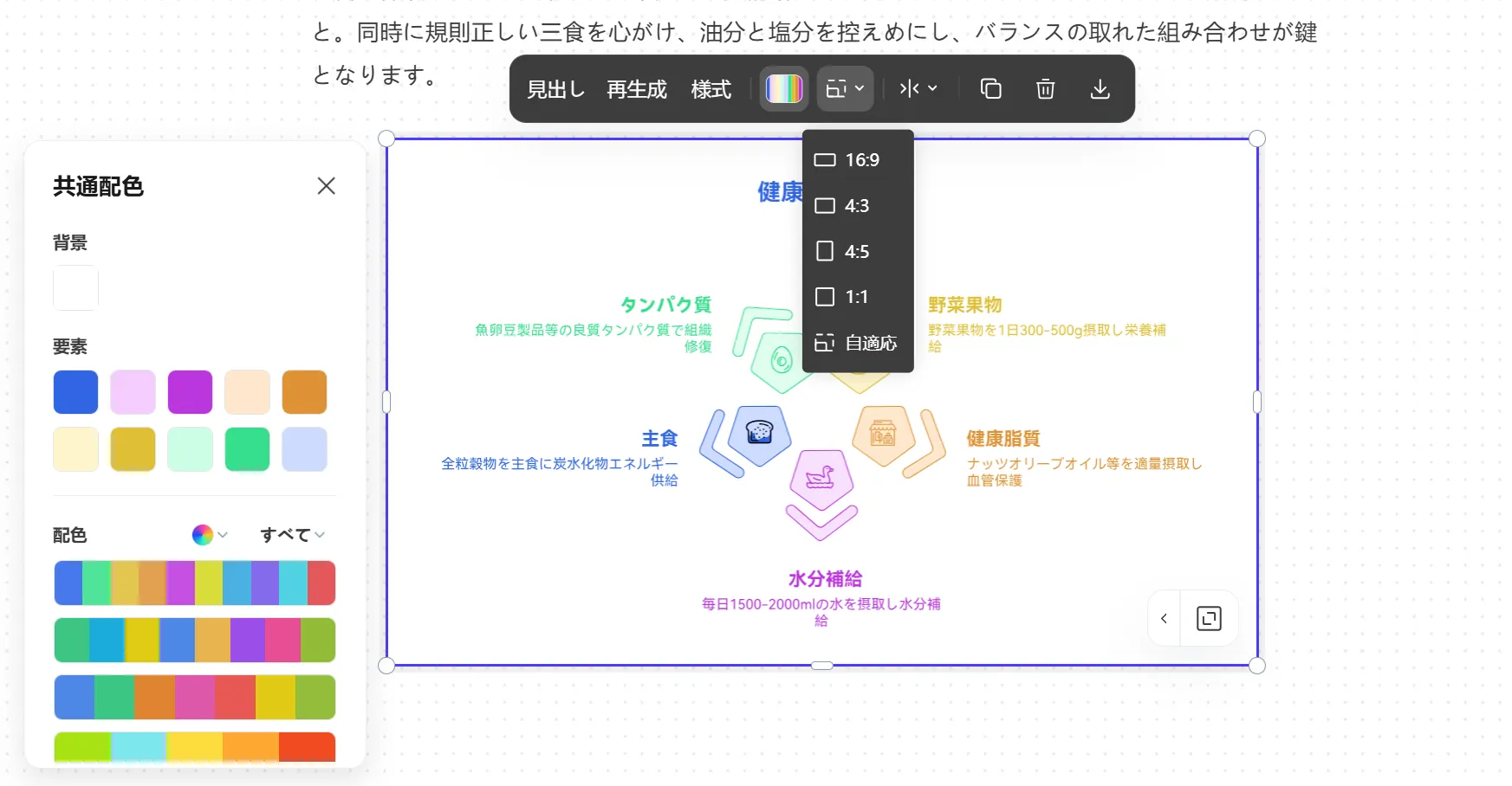 編集画面に、「健康的な食生活に必要な要素:⋯」といった形で要件を入力すると、AIが内容を読み取り、最適なインフォグラフィック形式を生成してくれます。