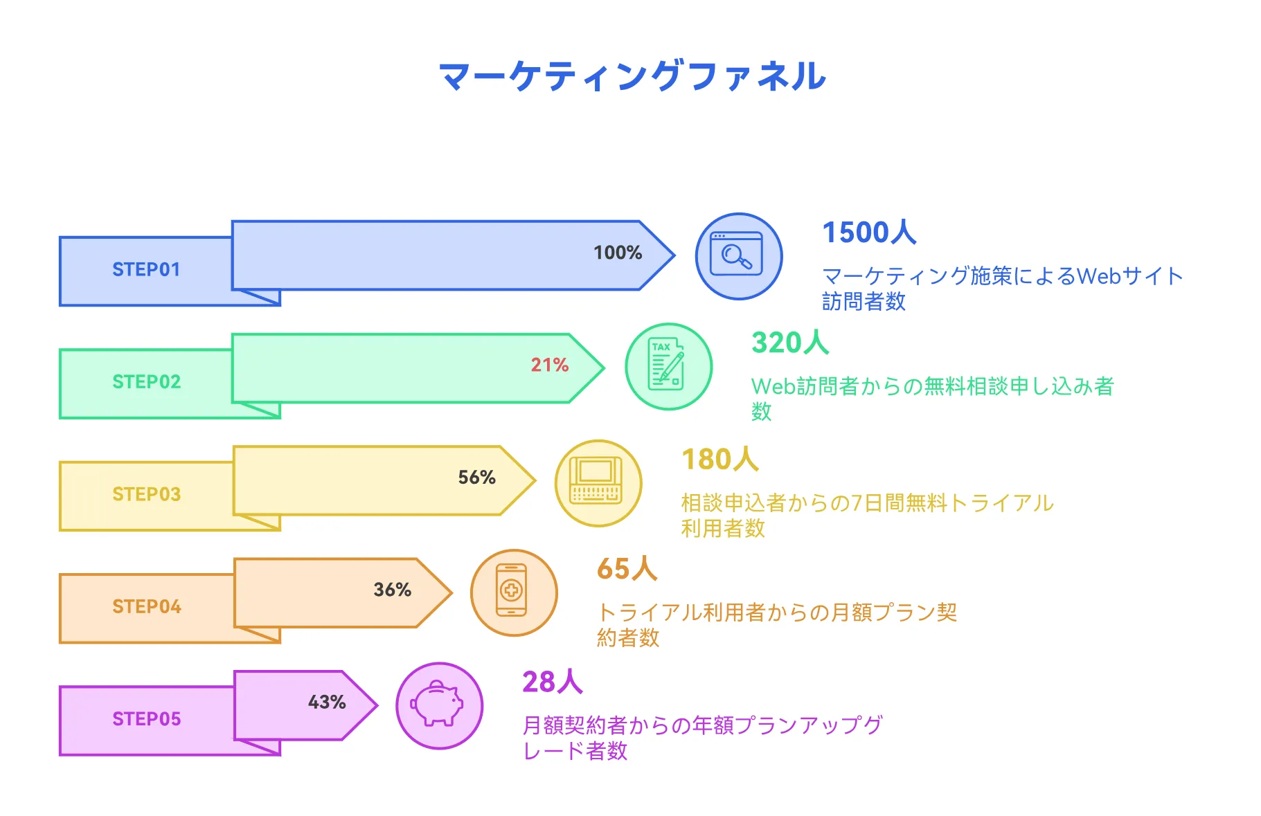 オンラインイベントのコンバージョン状況「露出1万回 → クリック2000回 → 参加500回 → 成約100回」をビジュアル化したい。
