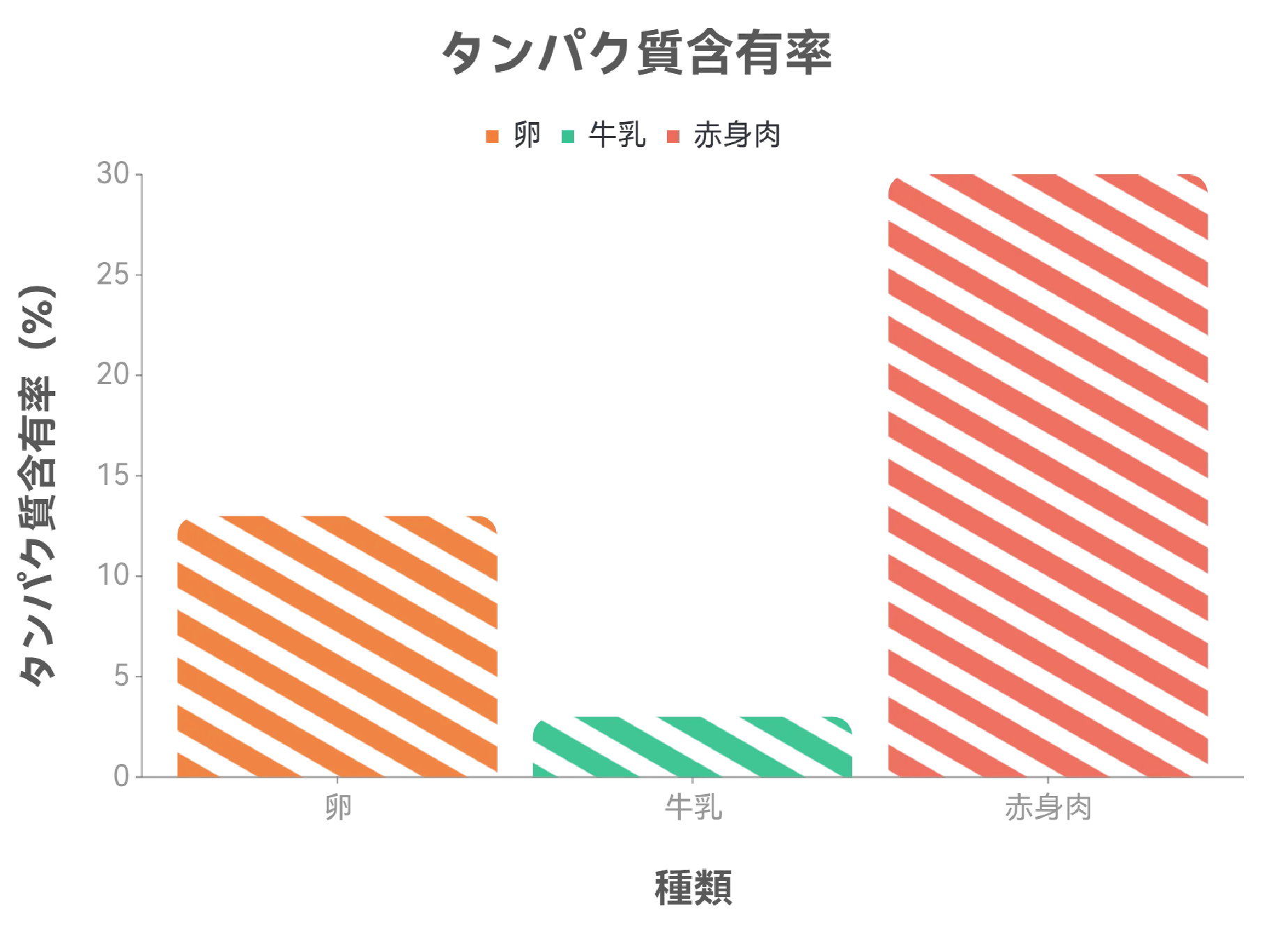 「卵・牛乳・赤身肉のタンパク質含有量」のデータを入力し、棒グラフを生成します。手描き風のスタイルを選び、ダウンロードして投稿に添付すれば、読者の閲覧体験も向上します。