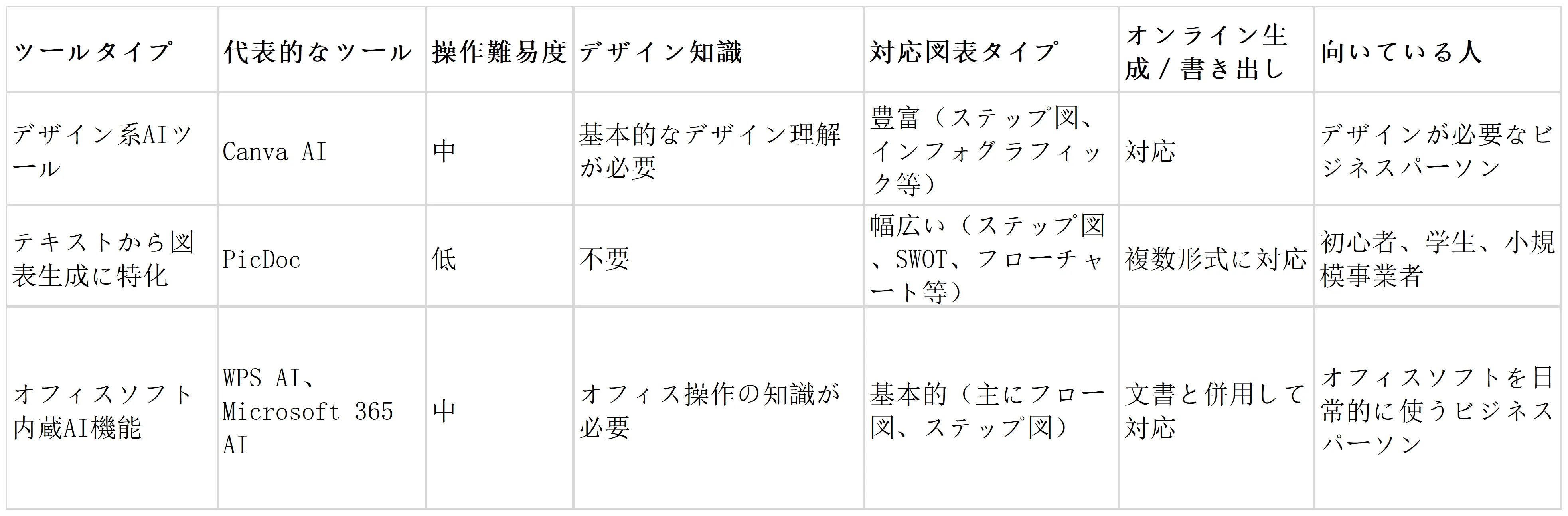 四、ツール別比較:主要AIステップ図作成ツール3タイプの特徴と違い