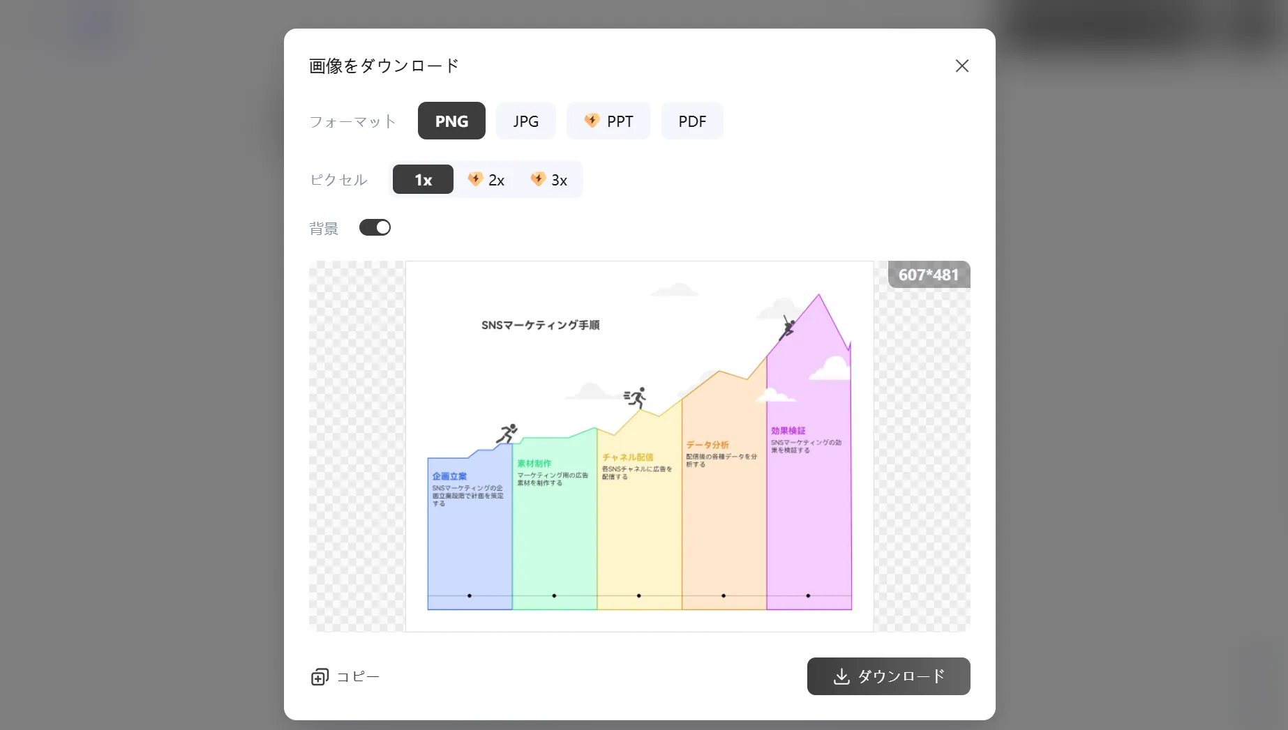 内容とデザインを最終確認し、問題がなければPNG・PDF・PPTなどの形式でダウンロードします。プレゼン資料、業務ドキュメント、SNS 投稿などにそのまま活用できます。