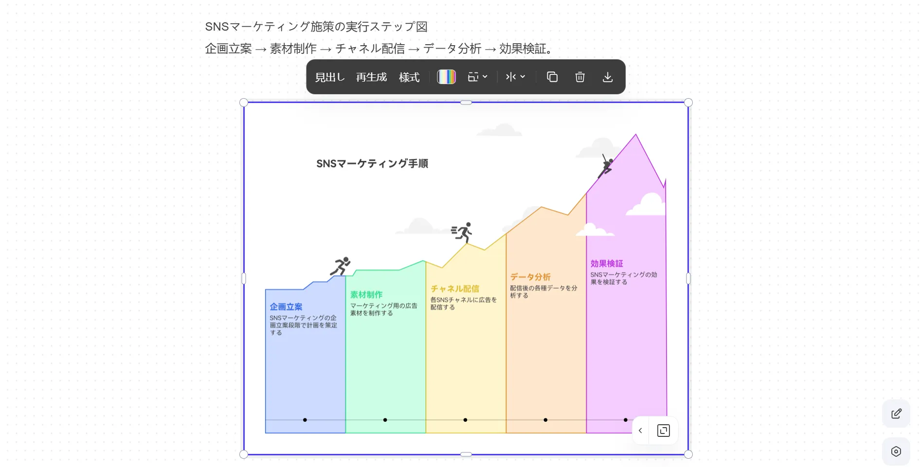 生成結果は編集画面で直接調整可能です。ノード配置を変更したり、テキストを書き換えたりできます。利用シーンに応じて、配色をシンプル/ポップに切り替えたり、ステップ図の縦横比を調整することも可能です。
